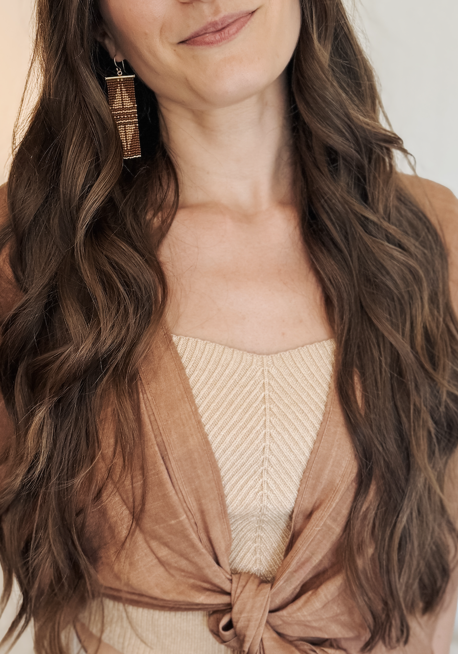 “Tifa’s weavings are more than a work of artistry… they are a prayer to the Earth and a reverent bow to beauty. So epic, and skillfully crafted, and yet somehow also so gentle and humble, all at once. These gorgeous earrings shimmer with the blessings she has poured into them, and radiate with vivid Earth tones… whisperings of the magical places and beings from where she has woven dreams into form. Thank you, sister for your devotion! I wear them with honor.”